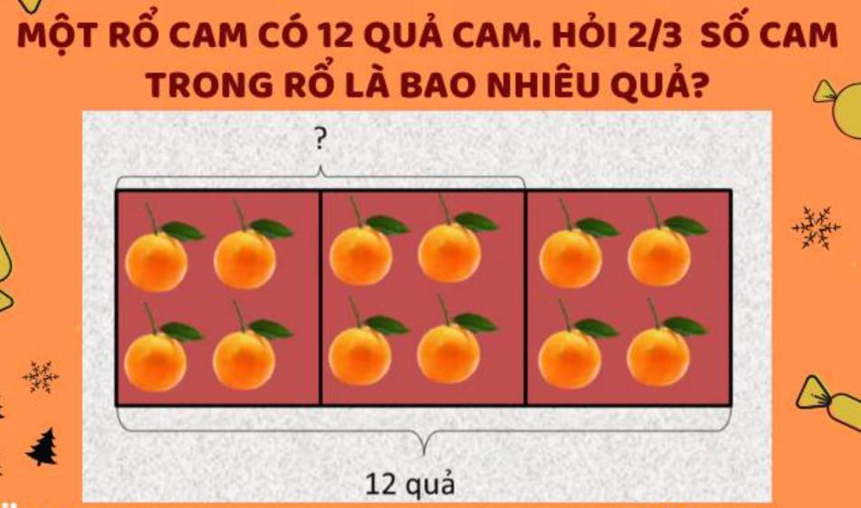 Một rổ cam có 12 quả cam. Hỏi  32 số cam trong rổ là bao nhiêu quả?