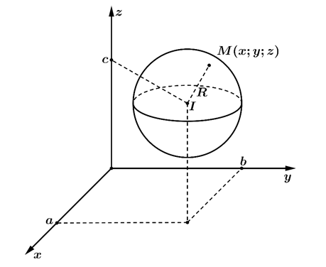 - Điểm M(x;y;z) nằm trên mặt cầu (S) nếu (x−a)2+(x−b)2+(x−c)2=R2.