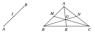 - Nếu I là trung điểm của đoạn thẳng AB thì IA+IB=0 ; IA=−IB ; AI=21AB;